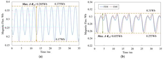 The calculation results of the magnetic flux ϕp4 in the magnetic yoke between magnet poles no. 4 and no. 5 are illustrated in Figure 13. In Figure 13a, there is a large fluctuation range of 0.17~0.375 Wb for the magnetic flux ϕp4 of the existing magnet without damping coils. The maximum peak-to-peak value is 0.205 Wb and the proportion of fluctuation is as high as 37.6%. In Figure 13b, the magnetic flux ϕp4 of the novel magnet with damping coils calculated by both models has a high consistency and the maximum error is only about 2%. The magnetic flux fluctuation range is 0.255~0.31 Wb and the maximum peak-to-peak value is 0.055 Wb, which is far lower than the existing magnet. The proportion of fluctuation is notably reduced to 9.7%. This illustrates that the damping coils are beneficial for suppressing magnetic flux fluctuation. Consequently, it can be inferred that the inductive voltage will reduce simultaneously.