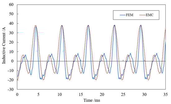 The inductive current of the damping coil corresponding to the magnetic flux ϕp4 is also calculated by both models, as pictured in Figure 14. The EMC result is similar to that of the FEM, with only a slight phase deviation. The upper peak value is less than 40 A, while the lower peak value is about −20 A. The effective value is approximately 14.5 A. Considering the current-carrying capacity of copper, it is sufficient to design the cross-sectional area of copper-enameled wire applied for damping coils to be over 2 mm2. As for the resistor connected in series with damping coil, they are installed on the surface of the box girder and dissipate heat through high-speed running winds. From the perspective of engineering applications, it is practical to apply the novel magnet with damping coils in a high-speed maglev train.