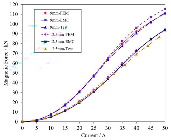 Figure 16 portrays the relationship between the static magnetic force and the loop current under different mechanical gaps. Throughout the entire current range, the static magnetic force results of EMC are closely aligned with those from the FEM and experimental tests when considering the nonlinearity of magnetic materials. With increasing currents, the static magnetic force exhibits a saturation phenomenon in the high current range. For the levitation magnet of the high-speed maglev train, the nominal mechanical gap is set to 9 mm and the nominal loop current is 25 A. At this moment, the calculated and tested magnetic force is about 45 kN.