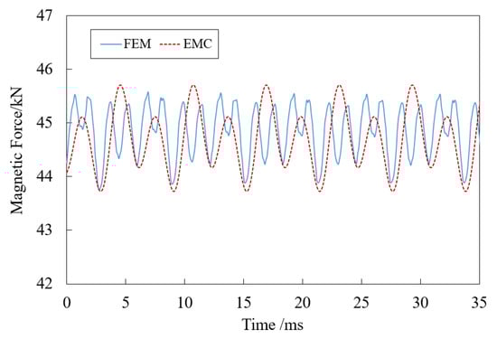 Dynamic magnetic forces are analyzed by both of the models as well, as shown in Figure 17. The overall magnetic force trends of the both models are similar, with average hovering around 45 kN. However, there is a higher frequency fluctuation in the FEM results compared to the EMC results. This discrepancy arises from the fact that, as mentioned earlier, only first and second harmonics are selected and added to the magnetic permeance between the magnet pole and the long stator. In fact, the tooth-slot effect can generate multiple harmonics.