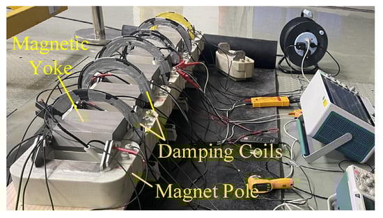 To verify the inference that the damping coil can effectively suppress the inductive voltage of the magnet pole, the damping coils are incorporated in to the equivalent ground test equipment, as shown in Figure 18, and the inductive voltage of the magnet pole is retested under the same power supply conditions as before. The inductive voltage test result is shown in Figure 19, and comparisons between the existing magnet and the novel magnet are summarized in Table 2. The maximum upper and lower peaks are 0.5 kV and −0.6 kV, respectively, with a maximum peak-to-peak value of Upp 1.1 kV, which has dramatically reduced compared to the existing magnet and been far below the voltage withstand test standard of 2.5 kV. As a consequence, the risk of magnet pole insulation failure is significantly reduced. From a practical perspective, damping coils can protect the insulation of the magnet pole from overvoltage by suppressing high-frequency magnetic flux fluctuation, thereby enhancing the service life of the levitation magnet.