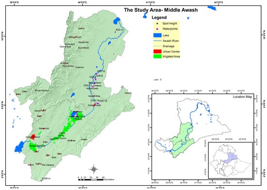 The Awash River Basin lies between 37°57′ E and 43°25′ E longitude, and between latitudes 7°53′ N and 12°00′ N (Figure 1). The Awash River is 1200 km long overall. It starts in Ethiopia’s central highlands at an elevation of 3000 m and passes through a number of locations before joining Lake Abe at a height of 250 m. The Awash River Basin, the basin where the study was undertaken, is divided into three sections: upper, middle, and lower. It is one of the most heavily utilized basins in the country, situated at a lower course of the most urbanized and industrialized Upper Awash. Middle Awash is known for having both large- and small-scale irrigation, as well as agroindustry and sugar factories (Wenji, Methara, and Kesem Sugar factories). The study area’s elevation gradient covered a range of elevations, from high mountains approximately 4199 m to low points 532 m above sea level (Figure 1). The Middle Awash Basin is primarily known for being water-scarce and occasionally flood-prone. There are tributary rivers, lakes, hot springs, and swamps in the Middle Awash Basin. One of the basin’s natural lakes, for example, is Lake Beseka, Ethiopia’s Lake, which was a saline lake located in the East African Rift Valley (Middle Awash). It has no natural exits and has grown significantly since the 1960s as a result of subsurface flows bringing excess irrigation water into the lake from subterranean flows, hot-spring inflow, and GW discharge.