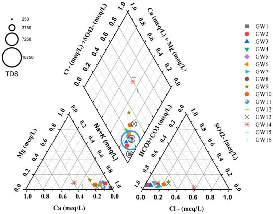 The electrical conductivity (EC) in GW samples, which indicates its salinity, is a useful tool for assessing whether water is suitable for agriculture and drinking. With an average of 3152 μS/cm, EC values range from 517 to 15,645 μS/cm. The influxes of saline lake water to groundwater may increase the salinity []. The maximum permissible limit of EC in drinking water, according to WHO standards, is 1500 μS/cm []. According to the results of the analysis, about 70% of the samples, or 11 samples, had EC values that were higher than the standard value; these high salinity values in the groundwater are apparent as a result of the influence of saline geothermal waters. High concentrations of dissolved salts in the GW from the sedimentary formations are also common as a result of the reaction of the often abundant evaporite minerals []. The range of TDS is 269 to 10,826 mg/L in the study area; the mean value is 2099 mg/L. The TDS was highest in sample GW11 (piezometer station).