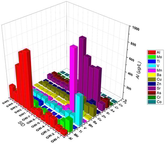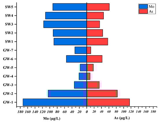 Strong alkaline molybdates have a high solubility for Mo(VI) oxides (MoO42−). Mo can exist in a wide variety of oxidation states, which are discussed in numerous Mo chlorides. Molybdenum (Mo) may be transformed in the LB catchment because of the hot weather, temperature, and volcanic factors around the lake. In Lake Beseka, under physiological conditions (at pH > 6.5), the molybdate anion, [MoO4]2−, is the sole molybdenum species in aqueous media [,]. Molybdenum compounds, including molybdenum trioxide and polymolybdates, transform rapidly to the [MoO4]2− ion under environmentally relevant test conditions. Protonated forms, such as [HMoO4]− and H2MoO4, are found at pH < 5 []. Molybdenum tends to be more mobile under alkaline conditions, but adsorption increases with decreasing pH []. In the study, we found that the highest concentration of Mo varied from 2.6 to 802.4 µg/L; a low concentration of Mo was observed at site GW15 (2.6 µg/L), whereas the highest concentration was observed in GW11 (802.4 µg/L).