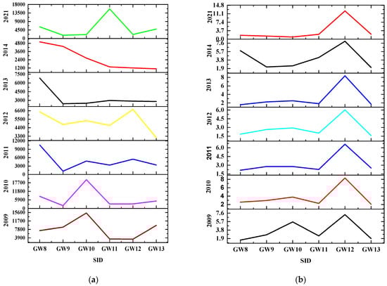 Meanwhile, the concentration of Mn varied from 2.4 µg/L to 908.5 µg/L; a low concentration of Mn was observed at site GW1 (2.4 µg/L), whereas a high Mn concentration was found at GW3 (908.5 µg/L). As shown in Table 2, for a particular well, the amount of dissolved iron and manganese in the groundwater changes seasonally. For instance, high concentrations of Fe (in 14 stations, or 87.5%) and Mn (in 11 stations, or 69%) were recorded in the partly wet season (10 November 2021). This variance is typically linked to the surface bringing in oxygenated water during times of strong recharge. The oxygenated water will keep the iron and manganese from dissolving, resulting in low quantities of these metals in the water drawn from the wells. Iron and manganese will dissolve once more in the recharge water when the oxygen has been used up, giving the water dissolved iron and manganese properties.