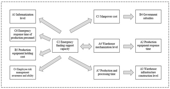 With respect to our findings, relevant suggestions for improving SEMRS are proposed. Specifically, the formal research structure is determined through expert questionnaires. The combination of DEMATEL and ANP is utilized to address the typical multi-attribute decision-making problem of SEMRS evaluation. The importance and causality of each influencing factor are determined, and key factors and causal relationships are identified accordingly. The results indicate that both suppliers and governments play important roles in the continuous supply of emergency materials. Eleven factors, namely, production equipment response time, warehouse infrastructure construction level, warehouse mechanization level, informatization level, production processing time, government subsidies, production equipment holding costs, emergency fund guarantee capacity, employee risk management awareness and ability, labor costs, and production staff emergency response time are identified as key factors affecting the SEMRS. Moreover, the emergency fund guarantee capacity, as the source affecting various factors, needs special attention.