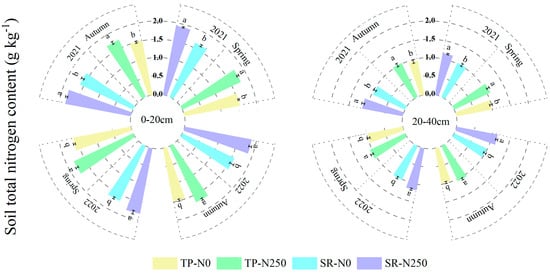 Soil total nitrogen content of 0–20 cm and 20–40 cm layers under straw return and nitrogen application. TP, traditional planting; SR, straw returning; N0 and N250 indicate nitrogen applications of 0 kg ha−1 and 250 kg ha−1. The bars represent the SE, and different lowercase letters indicate significant differences at p < 0.05.