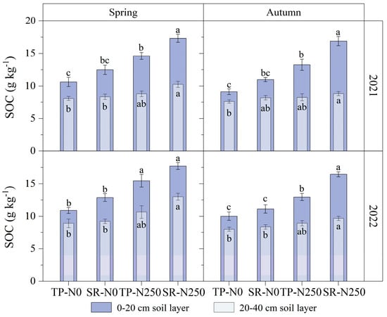 Significant effects on SOC were observed at depths of 0–20 and 20–40 cm due to N application rates and SR (Figure 2; p < 0.05). The N application rates × SR interaction was found to be significant in the 0–20 cm soil layer (p < 0.05). The SOC content of the 0–20 cm soil layer under the TP-N0, TP-N250, SR-N0, and SR-N250 treatments were 10.16, 14.06, 11.86, and 17.09 g kg−1, respectively. Comparatively, the SOC content showed a notable increase of 21.18% (2021) and 17.89% (2022) under the SR treatment (0–20 cm soil layer), as opposed to the TP treatment (p < 0.05). Similarly, at a 20–40 cm depth, the SOC content was 8.67% higher in 2021 and 10.24% in 2022 under the SR treatment compared to the TP treatment. Additionally, the N application led to a significant increase in the SOC content in the 0–20 cm soil layer when compared to the N0 treatment (p < 0.05). The SOC content of TP-N0 and TP-N250 has no significant difference at 20–40 cm (p > 0.05). Overall, higher SOC content was observed in the spring season compared to the autumn, with an average SOC content of 10.85 and 11.51 g kg−1 in 2021 and 2022, respectively.