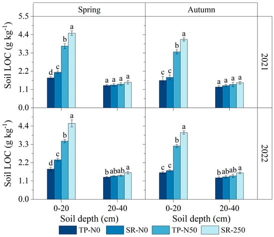 In both soil depths (0–20, 20–40 cm), the rate of N application significantly affected soil LOC contents (Figure 3; p < 0.05). However, the SR and SR × N interaction application rates only had significant (p < 0.05) effects on the soil LOC content of the 0–20 cm layer. The soil LOC content of TP and SR were 2.58, 3.16 g kg−1 (0–20 cm soil layer) and 1.36, 1.46 g kg−1 (20–40 cm soil layer). Relative to TP, the SR significantly (p < 0.05) promoted the soil LOC content of the 0–20 cm soil layer by 19.52% and 25.38% in 2021 and 2022, respectively. Similarly, in 2021 and 2022, SR treatment significantly (p < 0.05) increased the soil LOC content of the 20–40 cm soil layer by 6.01% and 8.70% compared to the TP treatment, respectively. The highest soil LOC content in both soil layers (0–20 and 20–40 cm) was observed for the N250 treatment. Additionally, the soil LOC content of the 0–20 cm soil layer was higher than that of the 20–40 cm soil layer.