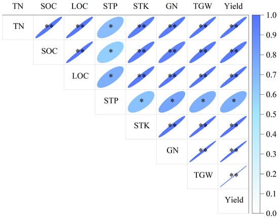 The correlation analysis of total nitrogen (TN), soil organic carbon (SOC), labile organic carbon (LOC), soil total phosphorus (STP), soil total potassium (STK) stem, grain number (GN), thousand-grain weight (TGW), and grain yield during 2021–2022. * p < 0.05 and ** p < 0.01.
