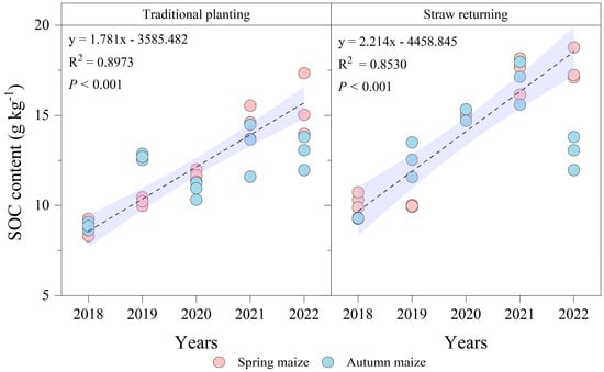 Regression analysis between years and soil organic carbon (SOC) content under the different straw treatments during 2018–2022. The black line represents the linear regression line; the light purple shaded area delimits the 95% confidence band.