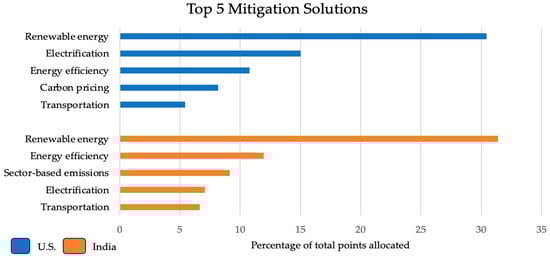 Experts focused less attention on their mitigation responses on how to deal with Public Actions, such as voting, household behavior, or purchasing decisions for small and medium enterprises. This limited attention is interesting given that the barriers experts identified for both mitigation and adaptation involve changing individuals’ beliefs to address political challenges or many local decision-makers for adaptation responses. Comments for mitigation tended to begin and end with price signals. While those are critical, the need for support to make those decisions—whether it is the lack of options, awareness, or financing—was mentioned as a barrier, which is supported by the literature [64]. More research to date has focused on what motivates individuals to act, e.g., [61,65], rather than helping to guide and simplify decisions for those individuals already willing to act. A potential pathway to implementation is necessary capacity-building for decision-making, such as through actionable science [66,67,68]. In adaptation, experts frequently noted this as local planning on where to site infrastructure. Taken more generally, the capacity to make effective decisions across society is a substantial issue that has not received much attention. Several India experts were very critical of the lack of action information coming from the scientific community. They were addressing weather and disaster forecasting for physical safety and infrastructure planning. At the same time, this notion could be extended to actionable information across a range of solutions that involve many decision-makers across sectors, behaviors, or geographies, including for mitigation.