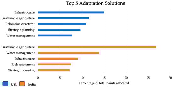 Top five adaptation solutions based on point allocations for experts in each country. Point allocations were assigned to secondary codes and then were summed from all experts who awarded points in their responses within each country to derive percentages.
