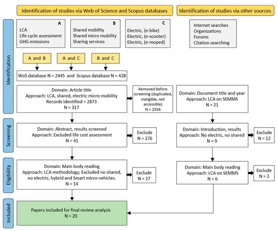 In the identification phase, keywords, databases, and search limitations were defined. The substrings used in the systematic search relevant to the scope of this study were identified and classified into three different categories: LCA (A group), sharing (B group), and electric modes (C group). The search focused on identifying studies that make all possible combinations of two words from these categories using the Boolean operators “AND” and “OR” to select only papers that contain at least one of the relevant keywords or terms. The Web of Science (WoS) and Scopus databases were used for the search, yielding more than two thousand records from the databases.