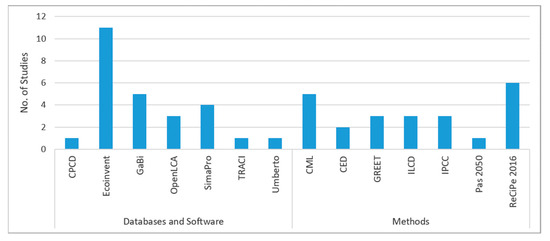 Regarding the impact assessment, ReCipe [32] and CML [33] in the updated 2016 version from 2016 were implemented in half of the reviewed studies, followed by the ILCD [34] and IPCC [35] methods in one-third of them. Furthermore, Hollingsworth et al. [13] in Raleigh, USA employed the TRACI [36] to convert inventory results into environmental impacts. Finally, only one study used Chinese databases [37]. Figure 2 shows the related databases, software, and methods used in the literature to analyze SEMMS LCA.