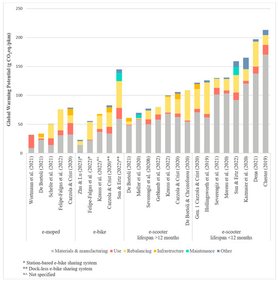 After the revision of different research works on the life-cycle emissions of SEMMS, Figure 3 summarizes and compares the GWP of SEMMS from the literature review divided by micro-mobility mode from different case studies around the world. It is shown that e-scooter sharing appears to be the most polluting micro-mobility mode and the one that has been studied the most in the literature. At first glance, there is a large variability in the results, from 55 to 213 g CO2eq./pkm. One of the reasons for such a great difference is the shorter lifespan of shared e-scooters compared to other vehicles (for a detailed explanation, see Section 5).