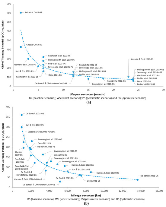 Despite the full use of renewable energy, the impact of the use phase remains minimal. Moller et al. [15] showed that the use of 100% renewable energy for charging in Paris resulted in a reduction of only 1 g CO2eq./pkm of its total GWP. In terms of lifetime mileage, the results indicate that low mileage in the life cycle is closely associated with a shorter lifespan and higher GWP [18,22,25]. On the contrary, higher mileage is associated with low GWP [2,9,12]. Furthermore, a study reflecting the initial years of operation of shared e-scooters in Lisbon assumed a lifespan of 45 days and a daily usage of 2 km, resulting in a lifetime mileage of 90 km, with 803 g CO2eq./pkm [17], the highest of all studies reviewed.