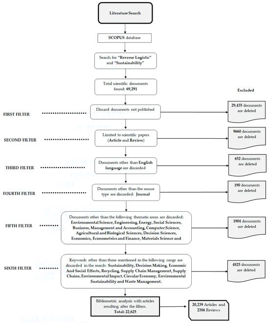 | Scopus * | (TITLE-ABS-KEY (“reverse logistic” OR “supply chain” OR “recycling” OR “decision making” OR “reverse logistic network” OR “green supply chain” OR “reverse supply chain” OR “closed-loop supply chain”) AND TITLE-ABS-KEY (“sustainability” OR “sustainable supply chain” OR “economic and social effects” OR “environmental impact” OR “environmental regulations”)) AND PUBYEAR > 2017 AND PUBYEAR < 2024 AND (LIMIT-TO (SRCTYPE, “j”)) AND (LIMIT-TO (DOCTYPE, “ar”) OR LIMIT-TO (DOCTYPE, “re”)) AND (LIMIT-TO (SUBJAREA, “ENVI”) OR LIMIT-TO (SUBJAREA, “ENGI”) OR LIMIT-TO (SUBJAREA, “ENER”) OR LIMIT-TO (SUBJAREA, “SOCI”) OR LIMIT-TO (SUBJAREA, “BUSI”) OR LIMIT-TO (SUBJAREA, “COMP”) OR LIMIT-TO (SUBJAREA, “AGRI”) OR LIMIT-TO (SUBJAREA, “DECI”) OR LIMIT-TO (SUBJAREA, “ECON”) OR LIMIT-TO (SUBJAREA, “MATE”) OR LIMIT-TO (SUBJAREA, “MATH”)) AND (LIMIT-TO (LANGUAGE, “English”)) AND (LIMIT-TO (EXACTKEYWORD, “Sustainability”) OR LIMIT-TO (EXACTKEYWORD, “Decision Making”) OR LIMIT-TO (EXACTKEYWORD, “Economic And Social Effects”) OR LIMIT-TO (EXACTKEYWORD, “Supply Chain Management”) OR LIMIT-TO (EXACTKEYWORD, “Supply Chains”) OR LIMIT-TO (EXACTKEYWORD, “Environmental Impact”) OR LIMIT-TO (EXACTKEYWORD, “Environmental Sustainability”) OR LIMIT-TO (EXACTKEYWORD, “Circular Economy”) OR LIMIT-TO (EXACTKEYWORD, “Recycling”) OR LIMIT-TO (EXACTKEYWORD, “Waste Management”)) |