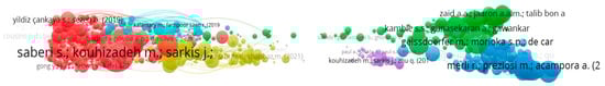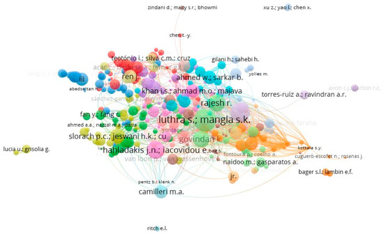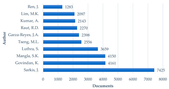 Figure 6 presents the ten authors with the most citations in their publications. Sarkis, J. is in first place with 7425 citations, followed by Govindan, K. with 4161, Mangla, S.K. with 4150, and Luthra, S. with 3659. The remaining six authors have less than 2600 citations in their publications. Furthermore, Figure 7 explores the relationship between authors and citations (minimum two articles), identifying 19 groups of authors with the most significant connection between authors and the number of citations. Authors Luthra, Sunil, Mangla, and Sachin Kumar have 702 citations. The first author belongs to the Department of Mechanical Engineering. They are located as directors in the All-India Council for Technical Education (AICTE), and the second belongs to the University of Plymouth, United Kingdom. They have collaborated with authors such as Sarkis, Joseph, Rajesh, Govindan, and Das D., who have generated several publications on reverse logistics and sustainability.