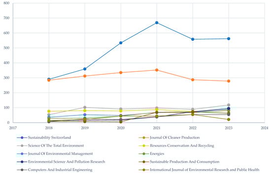 The Environmental Science knowledge area includes 9 out of 10 of the most active journals, mainly within the Q1 quartile, with a few in Q2. Social Sciences has a lower rank, but with Q1, it is only present in Sustainability Switzerland, which is number one among the most active magazines. Additionally, the subject area of Engineering, with a variation of Q1 and Q2, is covered in the journals: the Journal of Cleaner Production, Energies, Computers and Industrial Engineering, and Sustainable Production and Consumption. Finally, Figure 4 presents the list of journals with the number of articles per year between 2018 and 2023 to evaluate the trend over the years and the interest in reverse logistics and sustainability topics.