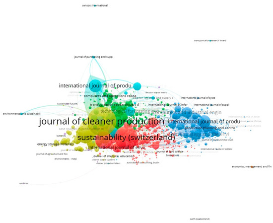 Figure 5 presents the network map of journals with the most citations on the topic and highlights 15 journals with the most significant link of citations. Sustainability Switzerland is the most influential magazine in terms of publications. This journal encourages scientists to publish research, promoting scientific predictions, estimates of global change impact, and sustainability and sustainable development studies. Despite this, based on citations, the most significant is the Journal of Cleaner Production, which aims at industrial innovation, new and improved products, and implementing new and cleaner processes, products, and services [35].