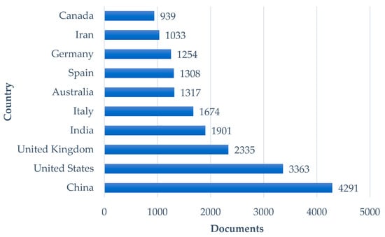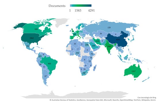 The distribution of reverse logistics and sustainability publications at a global level is presented in Figure 9. The publications come from 159 different countries. Europe ranks first with 14,325 publications, representing 40% of the total. Asia ranks second with 12,778 publications, corresponding to 35%. America ranks third with 6177 publications, around 17% of the total. Oceania follows with 1539 publications, representing 4%, and Africa with 1393 publications, also 4% of the total. China stands out as the country with the highest contribution of scientific publications, with 4291 articles.