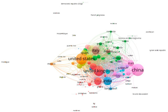 Figure 11 shows the relationship between countries vs. citations (minimum two articles) and 15 groups, with the most significant link between countries in the number of citations. China stands out with 114,831 citations, the United States with 97,281, the United Kingdom with 80,844, India with 54,966, and Italy with 47,651 citations. China collaborates with countries such as the United States, Italy, India, Australia, France, Iran, Spain, Brazil, and Hong Kong. The United States collaborates with countries such as Australia, the United Kingdom, Italy, Spain, India, Turkey, and Iran. The United Kingdom collaborates with countries such as Italy, Portugal, Malaysia, Nigeria, South Africa, Serbia, and Lithuania. This demonstrates the importance of sharing information for the creation of scientific knowledge.