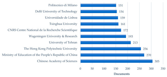 This section analyzes the performance of institutions that promote, and finance research related to reverse logistics and sustainability. The Chinese Academy of Sciences stands out for its participation in 305 publications. Additionally, it is observed that 80.52% of the institutions are universities, and 19.48% are study centers or institutes, such as the Indian Institute of Technology Kharagpur. These institutions also contribute to the generation of scientific information. Furthermore, among the ten most active institutions shown in Figure 12, Hong Kong Polytechnic University has the highest number of citations at 15.40%. The second institution is the Chinese Academy of Sciences, with 14.07%, followed by Wageningen University & Research at 10.90%, and Universidade de Lisboa at 6.19%.