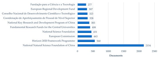Figure 13 illustrates the primary funding sponsors involved in reverse logistics and sustainability research. The National Natural Science Foundation of China stands out by funding 2154 articles since its establishment. It supports basic research, promotes international cooperation, and adapts to new changes [63]. Table 6 indicates that three funding entities are from China, two are from the European Union, two are from Brazil, and one is from Belgium, the United States, and Portugal.