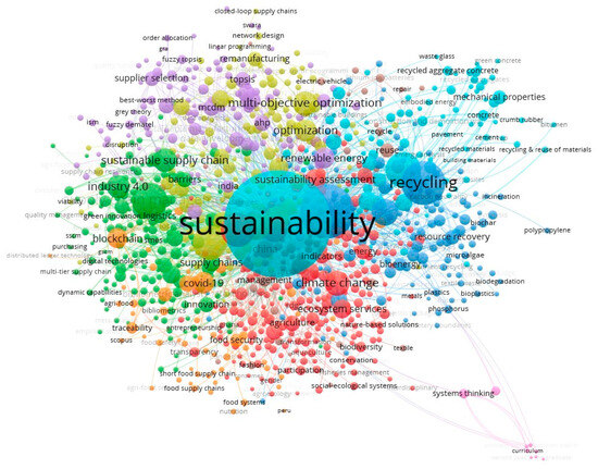 In this way, for the analysis of the preliminary phase of the study, Figure 2 presents a network map with the final 22,625 documents. The relationship between them was identified through VOSViewer version 1.6.18, with 6 clusters among the topics, notable for subfields within a specific area, such as Blockchain technology, circular economy, product elimination, and sustainable innovation. Of the six main clusters, several publications were identified in the International Journal of Production Research, which has existed since 1961. Still, specifically in the subject matter, noteworthy articles existed between 2018 and 2019.