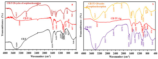 FTIR spectra of (a) CH-F and (b) CH-TU after Ag(I) sorption and after 20 cycles of sorption and desorption of silver.