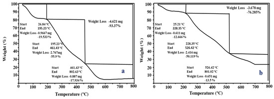 (a) The first step was assigned to the release of absorbed water, showing at 195.2 and 228.3 °C for CH-F and CH-TU, respectively; the loss in weight at this step is around 19.53 and 12.66% for both sorbents, respectively.