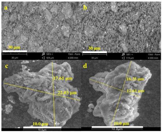 Figure 4a–d show the scanning electron microscopy images and the size of the particles. Both sorbents seem to have the same external shape, which is characterized by an elongated structure; the majority of the particles had an unsymmetrical structure. It was noted that the size decreased after functionalization from an average of 19 µm to 14 µm for CH-F and CH-TU, respectively.