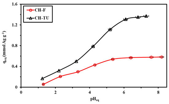 Under the selected experimental conditions (T: 21 °C and pHeq: 6.4), the sorption capacities of both sorbents reached 0.549 and 1.31 mmol g−1 for CH-F and CH-TU, respectively. This means that the sorption increased 2.5-fold as a result of functionalization by thiourea. The preference of thion (thiol groups) for silver can be explained by the hard and soft acids and bases theory (in which the silver ions are considered as soft acids which are attracted to a soft base (thiol groups)) or the S-based ligands [42]. Figure S3 shows the variation in the pH after sorption, which indicates that the two sorbents had the same profile at acidic pH (slightly increased), and the opposite trend was shown in slightly acidic or alkaline media. It was shown that after pH 6, CH-F slightly increased, while CH-TU slightly decreased; ∆pH ≈ 0.4 pH.