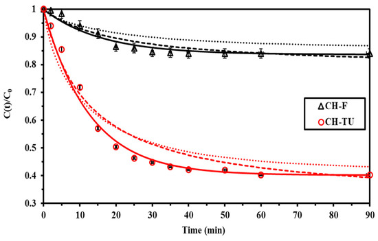 Several profiles were used for the uptake kinetics, i.e., resistance and diffusion rate, which include the film, intraparticle and bulk diffusion and proper reaction rate [90] in the batch system. The bulk reaction rate and resistance to film diffusion were minimized by the agitation speed (210–220 rpm (the sorption condition)), which is sufficient to minimize these kinds of profiles. Therefore, the analysis of kinetic profiles was performed with the PFORE (pseudo-first-order rate equation), PSORE (pseudo-second-order rate equation) and RIDE (resistance to intraparticle diffusion), which is the so-called Crank equation. Table S1 reports the relevant equations and the parameters of each one. In Figure 6, the faster sorption kinetics of the functionalized sorbent are shown compared to the non-functionalized one. Total saturation of CH-TU and CH-F was achieved within 30 and 40 min, respectively. The PFORE fitted the experimental profiles for both sorbents, in which the initial slopes of both sorbents follow the same trend. The low values of the error bars confirm the high reproducibility of the experimental test.