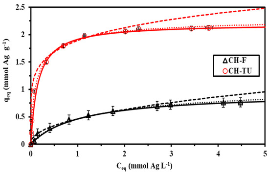 Figure 7 shows a comparable study of the two sorbents using the sorption isotherms (qeq = f(Ceq)). The sorption properties were improved by grafting thiourea moieties (increased by three-fold) under the selected experimental conditions (pH0 6 at room temperature (21 ± 1 °C)). The maximum sorption capacities reached 0.763 mmol Ag g−1 and 2.125 mmol Ag g−1 for CH-F and CH-TU, respectively. The expected binding mechanism of Ag(I) ions in CH-F occurred through the amine and hydroxyl groups (which are considered as hard base groups), while in CH-TU, the thiol shared the binding with the already existing functional groups (through tautomerization of thion groups). Sulfur-based materials are considered as a soft base and favorable for Ag(I) (a soft acid). The three models are shown in Figure 7. The Freundlich equation (dash lines; with a bad fit) is known as a power-type equation. The Langmuir equation (solid lines) describes monolayer sorption without sorbed interactions, with an expected homogeneous sorption energy, and the Sips equation (dotted line; combination of Freundlich and Langmuir equations; the third parameter is used for adjusting and improving the mathematical quality of fits) was considered a good fit for the experimental data.