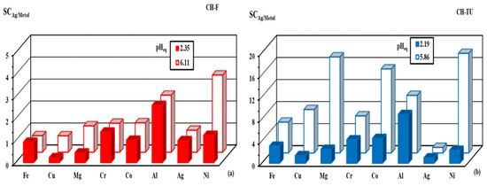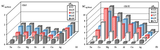 Acidic effluents contain diverse competitive ions, which affect the sorption performances of the prepared sorbents. This test was conducted to estimate the impact of polymetallic components on the sorption efficiency of the target metal ions. Both sorbents were tested for Ag(I) sorption in an equimolar solution with 1 mmol L−1 of Na(I), Mg(II), Ca(II), Fe(III), Al(III) and Cu(II). The sorption experiments were performed at different pH values (ranging from 3 to 7). Figure 8 shows the effect of pH on the selectivity ratio of CH-F and CH-TU for Ag(I) against other metal ions. SCAg/Metal was calculated using the below equation, Equation (3):