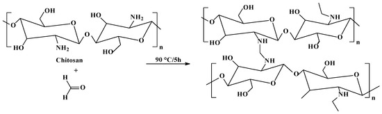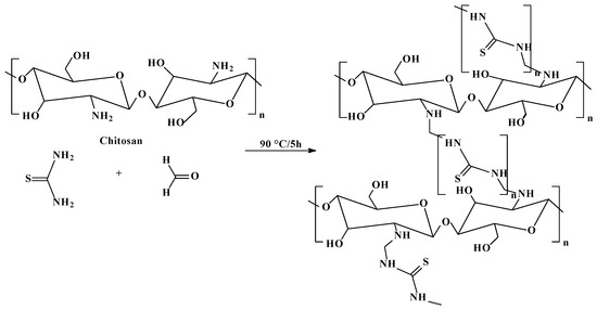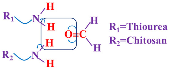 The expected synthesis mechanism was assigned as an elimination reaction of oxygen from formaldehyde with two protons from the amine groups (of either chitosan and/or thiourea, depending on the sorbent), as shown in Scheme 3.