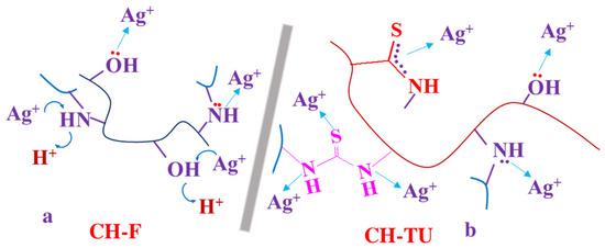 The expected sorption mechanisms of Ag(I) and the reactive functional groups were determined through the data collected from FTIR spectra (through the functional groups that are used in the sorption, emphasizing the formation of thiol groups through tautomerization of the thion groups in the composite); through pHPZC, which shows the overall charge of the sorbent; and through the metal speciation of Ag(I), as in Figure S2 (which provides two species at the experimental pH: free cationic Ag+ species and an aqua complex (Ag(H2O)4+)). These data indicate variable values for both sorbents; the maximum sorption pH was below the pHpzc point for CH-TU and over it for CH-F. Mixed mechanisms were predicted using the chelating properties (the deprotonated functional groups) of the completely negatively charged functionalized sorbent and the partially positively charged non-functionalized one with the positively charged metal ions (either as free cationic species or as a partially dehydrated aqua complex). At this pH (optimum sorption), electron pairs on the chelating groups will be available for binding with positively charged metal ions, indicating mainly chelation for CH-TU and a mix of chelation and ion exchange for CH-F, as shown in Scheme 4.