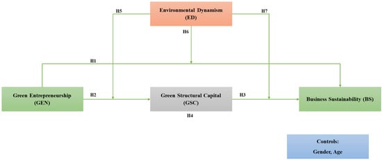 Furthermore, existing research tends to overlook the influence of environmental dynamism on the relationship between GEN, GSC, and BS in Turkish SMEs. Environmental dynamism means that the natural environment, rules, and market conditions can change very quickly. This can significantly impact the effectiveness of green business ideas and the utilization of structural capital [28]. However, studies often treat environmental dynamism as a peripheral factor rather than a central determinant of sustainability outcomes in SMEs [29]. Therefore, this study aims to fill this research gap by examining the specific relationship between GEN, GSC, and BS in Turkish SMEs, taking into account the moderating role of environmental dynamism. By analyzing these relationships, this research seeks to provide a comprehensive understanding of the mechanisms driving sustainable entrepreneurship in Turkey’s SME sector and promoting sustainability in emerging economies.