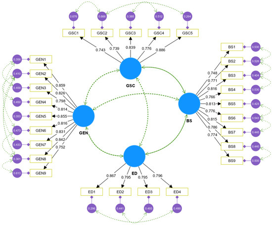 To assess GEN, a set of 9 measurement items was adapted from [82]. This included items assessing the integration of environmental considerations into business practices, commitment to green research and development, and the drive toward market leadership in green innovations, reflecting both the entrepreneurial spirit aimed at minimizing environmental degradation and the pursuit of innovative green business models. We evaluated GSC using 5 items derived from [83]. These items reflect the accumulation and utilization of green knowledge within an organization, such as the superiority of environmental protection management systems compared to competitors, investment in environmentally friendly facilities, and capacity for developing green products. We gauged ED, a critical factor, using 4 items from [84,85,86]. These items capture the frequency and magnitude of changes in market conditions, including shifts in consumer demographics, governmental regulations, and product life cycles, underscoring the unpredictable nature of the external environment that businesses must navigate. Lastly, BS was quantified using a comprehensive set of 9 items sourced from reference [87]. This includes significant increases in revenues, market shares, and overall income, as well as improvements in environmental outcomes and occupational health. The detailed items used to measure each of these constructs are provided in Appendix A.