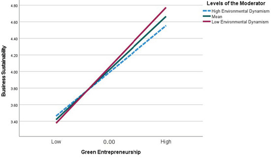 ED moderates the indirect relationship between GEN factors and BS. Specifically, the impact of GEN on BS is more prominent when SMEs face lower levels of environmental uncertainty.