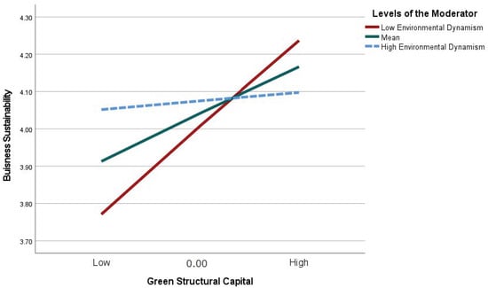 The literature suggests that high environmental dynamism creates challenges for maintaining stable operations as firms in dynamic environments need greater flexibility and adaptability [40], and environmental dynamism can impact the effectiveness of sustainable practices [41]. This research makes several original contributions to the existing body of knowledge. While previous studies have explored green entrepreneurship and business sustainability separately, this study highlights the pivotal role of green structural capital as a mediating factor, providing a more nuanced understanding of how internal organizational capabilities influence sustainability outcomes.