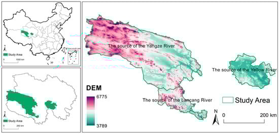The Sanjiangyuan National Park, situated in the core region of the Tibetan Plateau, stands as a vital ecological reserve and biodiversity conservation center in China. Spanning from 32°22′36″ to 36°47′53″ north latitude and 89°50′57″ to 99°14′57″ east longitude, with an average elevation exceeding 4500 m above sea level, the park serves as the source of the Yangtze, Yellow, and Lancang Rivers, contributing an average multi-year runoff of 49.9 billion cubic meters [28]. Characterized by towering mountains, deep-cut canyons, and numerous lakes, the park’s topography has been shaped by freeze–thaw erosion, resulting in distinctive landforms and ecosystems. Encompassing a planned area of approximately 123,100 square kilometers, it comprises three main sections: Yangtze River Source, Lancang River Source, and Yellow River Source. These areas not only play a pivotal role in ecological preservation but also serve as crucial sanctuaries for biodiversity conservation. The protection of Sanjiangyuan National Park holds paramount importance in safeguarding national ecological security and advancing the development of ecological civilization. The study area is depicted in Figure 1.