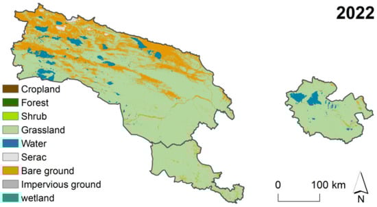 Land use data (LUCC) with a spatial resolution of 30 m for Sanjiangyuan National Park for 2022 were acquired from the ZENODO database [29], as shown in Figure 2. Vector boundary data were sourced from the Resource and Environment Science Data Center. Environmental data collection encompassed MOD13A2 Normalized Difference Vegetation Index (NDVI) [30] and SRTM Digital Elevation Model (DEM) data provided by National Aeronautics and Space Administration (NASA) [31]. The data processing involved data clipping and setting all data to a spatial resolution of 1000 m by 1000 m in the Krasovsky 1940 Albers coordinate system. Using the Create Fishnet tool in ArcGIS 10.8, we divided the region into square grid cells measuring 10 km by 10 km, resulting in a total of 1428 grid cells. Landscape pattern characteristics were then calculated for each grid cell. Subsequently, using ArcGIS 10.8, we assigned centroids to each cell and conducted ordinary kriging interpolation. Finally, after reclassification, we obtained the spatial distribution map. As shown in Table 1.