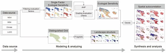 In this study, we employed both global bivariate Moran’s I and local bivariate Moran’s I to evaluate the spatial relationship between ecological sensitivity and landscape pattern indices [42]. The global bivariate Moran’s I assesses the linear association between ecological sensitivity and landscape pattern indices across the entire study area, yielding values ranging from −1 to 1. These values denote varying degrees of spatial autocorrelation, from very strong negative to strong positive spatial autocorrelation. Calculation of this index enabled determination of significant spatial correlation between the two variables. Conversely, the local bivariate Moran’s I was utilized to examine spatial correlation at local levels, producing cluster maps that categorized spatial units into four types: high–high, low–low, high–low, and low–high. These classifications unveiled diverse spatial correlation patterns, aiding in the identification of areas with heightened ecological integrity. GeoDa 1.14 software was utilized for the computations and visualization of local spatial association maps, with a significance level set at 0.01 to ensure analytical reliability. The research framework is shown in Figure 3.