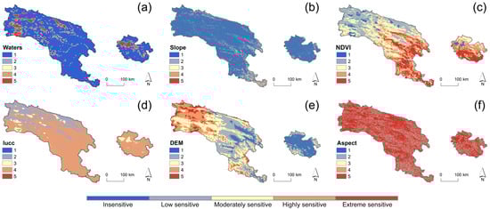 Single ecological sensitivity analysis map. (a) Watershed sensitivity analysis; (b) Slope sensitivity analysis; (c) Vegetation sensitivity analysis; (d) Land use type sensitivity analysis; (e) Elevation sensitivity analysis; (f), Aspect sensitivity analysis.