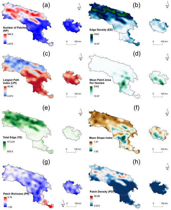 Spatial distribution map of landscape pattern indices. (a) NP visualisation map; (b) ED visualisation map; (c) LPI visualisation map; (d) Area_MN visualisation map; (e) TE visualisation map; (f) Shape_MN visualisation map; (g) PR visualisation map; (h) PD visualisation map.