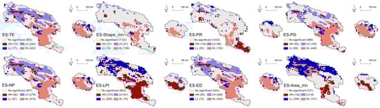 In the Sanjiangyuan region, Moran’s index analyses of both the ecological sensitivity index and the landscape pattern index unveiled intriguing spatial relationships. These indices showcased varying degrees of spatial aggregation or dispersion, elucidating the intricate interplay between ecology and landscape across the region, as shown in Table 7. Negative Moran’s indices, such as −0.344 for total edge length (TE), −0.330 for number of patches (NP), and −0.399 for edge density (ED), indicated a tendency for areas with higher attributes to border areas with lower attributes. This spatial distribution pattern may underscore the degree of fragmentation within the ecological landscape, where increased marginalization and dispersion in patch numbers might stem from human activities or natural geographic factors, potentially hindering ecological connectivity. Conversely, Moran’s indices for maximum patch index (LPI) and average patch area (Area_mn) stood at 0.337 and 199, respectively, signaling a spatial aggregation trend. This suggests that sizable, contiguous patches and larger mean patch areas tend to cluster in specific regions, likely fostering better ecological connectivity and lower fragmentation, thus supporting biodiversity and ecosystem services. Regarding patch shape index (Shape_mn) and patch richness (PR), the Moran’s index hovered around −0.192 and −0.01, respectively, with near-zero values indicating nearly random spatial distribution. This phenomenon may imply that these ecological features experience minimal anthropogenic or natural geophysical influences. Collectively, the spatial distribution characteristics of ecological and landscape pattern indices in the Sanjiangyuan region delineate both challenges and opportunities for ecological conservation and management. By pinpointing the spatial aggregation traits of these indices, tailored conservation strategies can be more effectively devised to bolster ecological connectivity and enhance overall ecosystem health and stability. Such analyses furnish a scientific foundation for ecological conservation efforts and furnish guidance for future ecological management and conservation strategies.