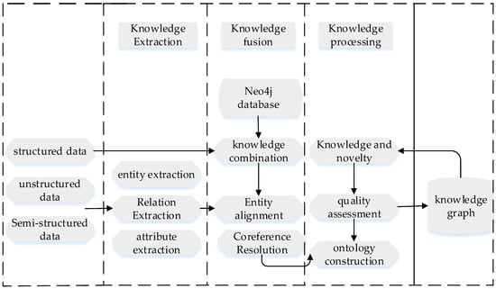 Based on unstructured, semi-structured, and structured data, knowledge is extracted and stored through manual, automatic, or semi-automatic processing methods, ultimately constructing a knowledge graph. The construction process requires continuous updating and iteration with the growth of knowledge. Each iteration mainly consists of three stages: knowledge extraction, knowledge fusion, and knowledge processing. The construction process of the knowledge graph is illustrated in Figure 1.